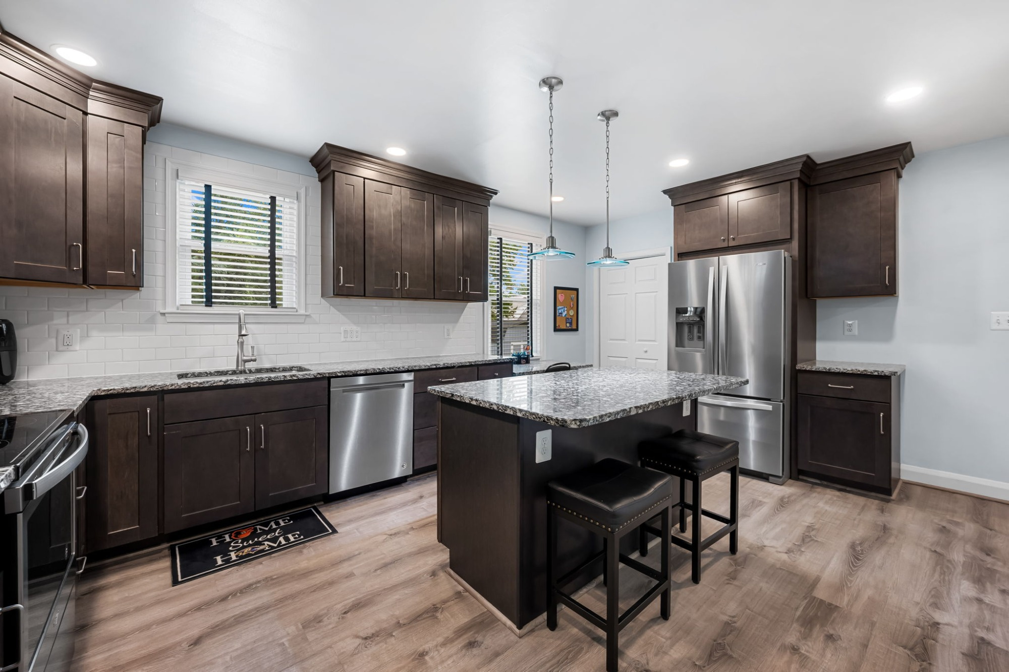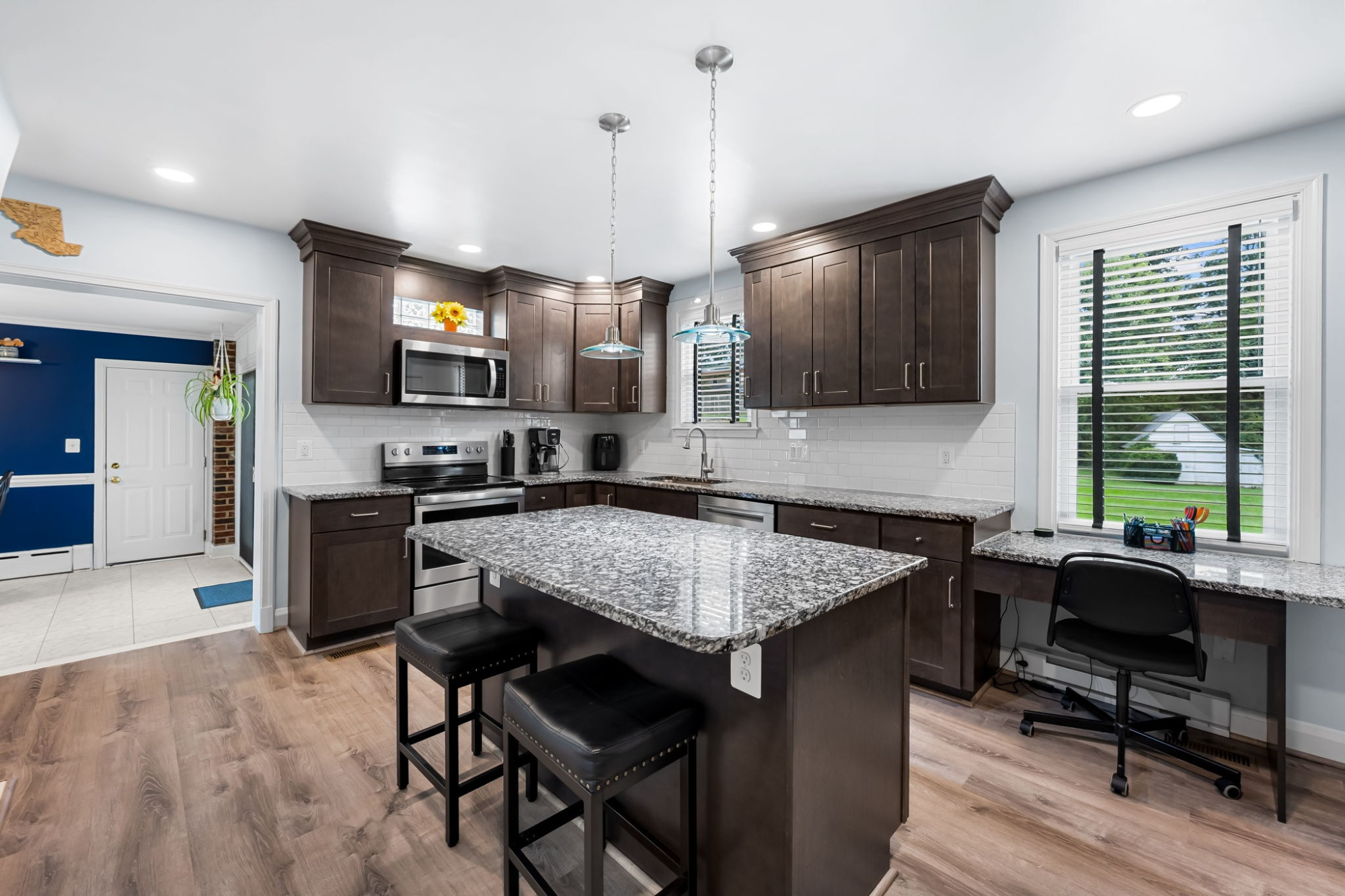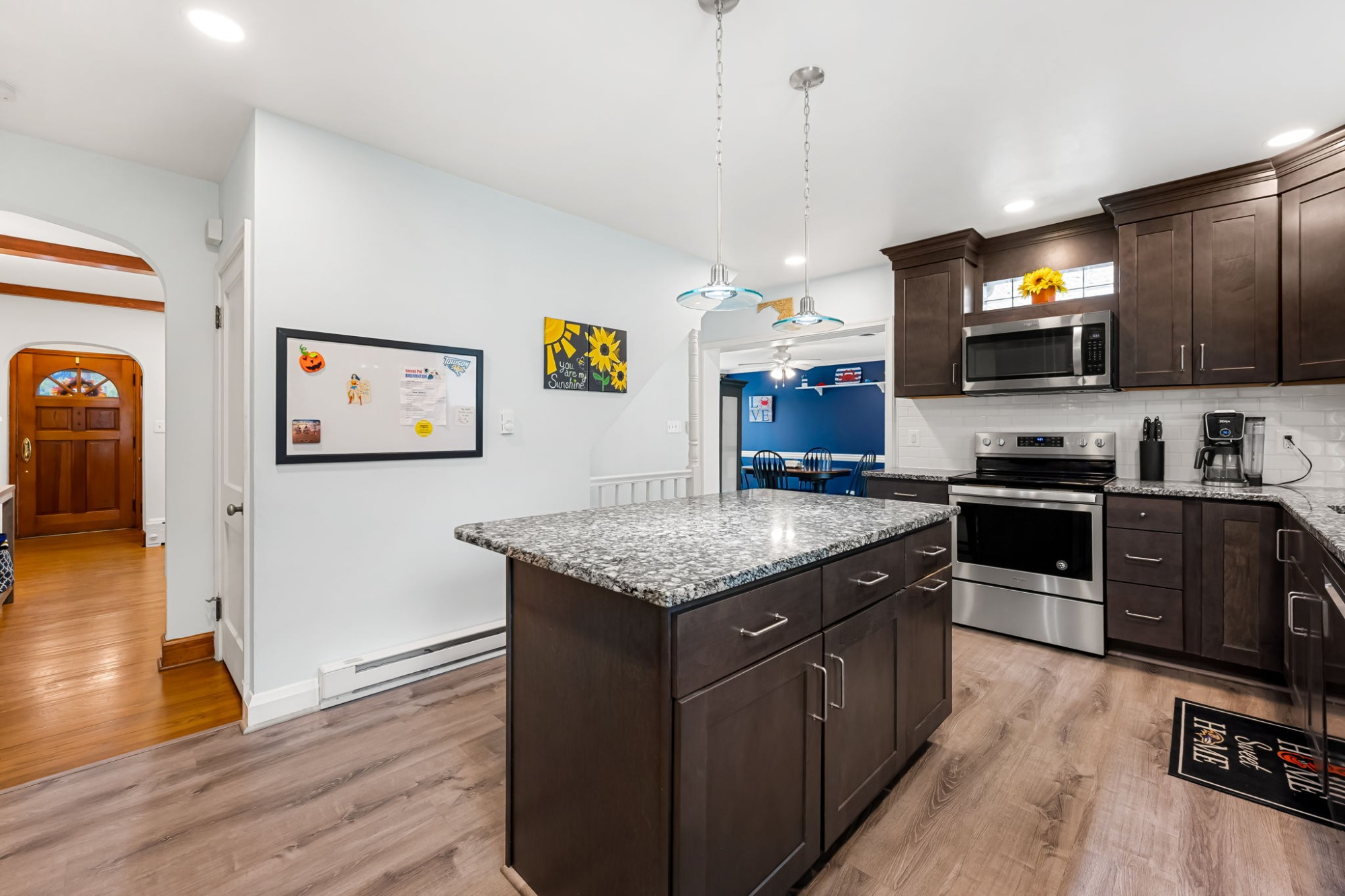 Tucked away in the heart of Nottingham, 4201 Halbert Road offers the perfect blend of privacy, space, and charm. This beautifully maintained Cape Cod boasts over 2,900 square feet of finished living space across three levels, with four spacious bedrooms and three full baths. The recently renovated kitchen is a true centerpiece—featuring upgraded countertops, recessed lighting, and a built-in desk ideal for remote work or homework. It opens seamlessly into a ceramic-tiled dining room and out to a sprawling deck, perfect for entertaining or enjoying quiet evenings overlooking the landscaped, partially fenced yard. The main level includes a cozy living room with fireplace, two bedrooms including the primary suite, and a full bath. Upstairs, discover a bright family room, two additional bedrooms, and another full bath—ideal for guests or growing families. The fully finished lower level adds even more versatility with a second family room, laundry, storage, and a third full bath. With central air, hardwood floors, and thoughtful updates throughout—including newer roof and windows—this home is move-in ready. The oversized two-car garage with inside access and concrete driveway offers parking for six. Located in the Perry Hall school district and just minutes from Belair Road, this property combines suburban tranquility with everyday convenience. Whether you're hosting holidays, playing in the expansive yard, or relaxing on the deck, 4201 Halbert is a place to make lasting memories. Welcome home.